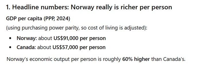 Norway’s GDP per capita is among the highest in the world.  Canada’s has been falling, even as its population explodes.